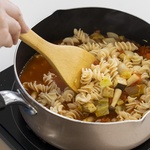 - 茹で上がったパスタを加えてひと煮たちさせる。