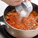 - 全体に油が回ったらトマトの水煮・水を加え煮込む。