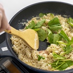 - 火を止めてから、茹で上がったパスタとサラダほうれん草・粉チーズを加え、混ぜ合わせる。