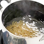 - 玄米パスタを8分茹でる。(たっぷりのお湯に1%~1.5%の塩を入れる。)