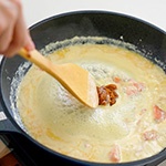 - 豆乳を加えて、2/3程度の量になるまで煮詰め、味噌を入れて味を調える。
