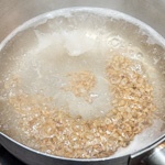 - そば米を沸騰したお湯で8分ゆで、人肌になるまで冷まして流水で洗ってざるにあげる。