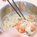 - 生地の材料をダマにならないように混ぜ合わせたら、むきえびを入れて混ぜる。