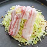 上に桜えび、キャベツ、長ねぎ、天かす、豚ばら肉をのせて、生地の端が反り返るまで4~5分焼く。