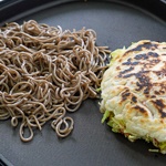 - ホットプレートの空いたスペースでそばを焼き、めんつゆで下味をつける。