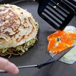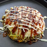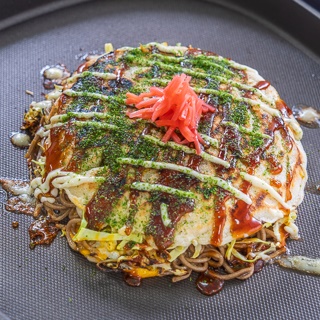 - 表面にお好みソースを塗り、マヨネーズ、青のり、紅しょうがを散らしたら完成。