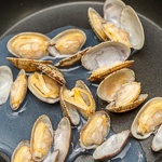 - 鍋に砂抜きしたあさりと酒を入れる。ふたをしてあさりの殻が開くまで2~3分酒蒸しにする。