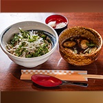 - ゆでたそばを氷水でしめて器に盛り、大根と焼きばらのりをのせる。