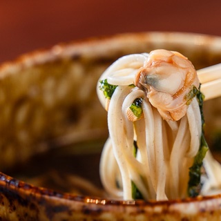 あさりの入った温かいつけ汁に、そばと食感楽しい大根をつけて。