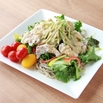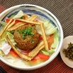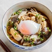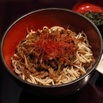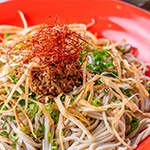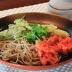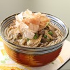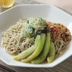 - そばをゆでて冷水でしめたら器に盛り、小口切りにした万能ねぎと3の鶏そぼろをのせて1の揚げごぼうをちらす。お好みで糸唐辛子をのせたら完成。