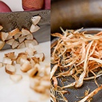 - ごぼうをよく洗い、そぼろ用はいちょう切り、揚げごぼう用はささがにして別々に1分ほど水にさらしてざるにあげる。