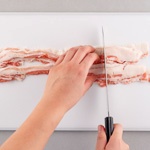 玉ねぎは2㎜幅の薄切り、にんじんは5㎜幅の半月切り、しいたけは石づきを落とし軸とかさに分けて3㎜幅の薄切り、なすはガクをとって1㎝幅の半月切りにする。