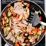 - 別のフライパンにサラダ油大さじ1を入れ中火にかけ、豚バラ肉、にんじん、しいたけ、なすを入れ軽く焼き色がつくまで焼く。
