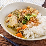 - お皿にご飯と出来上がったカレーを盛り付け、かつおぶしと長ねぎ(1㎜程度の薄切りにしたもの)をトッピングして完成。