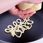 - フライパンにサラダ油を薄くひき中火で熱し、一度濡れ布巾に乗せて冷ましたあと弱火にかけ、生地をくるくると絞り出す。
