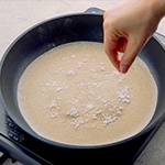 - フライパンを強火で熱し、フライパンが十分に温まったら(生地を流してジュワと音がなる程度)、中火にして3の生地を流し入れ、フライパンを回しながら均一にのばす。