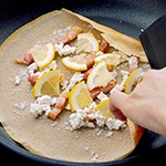 - 生地のフチが浮き上がってきて焼き色がついたら、2のベーコン、カッテージチーズ、レモンを盛り付け、生地が四角くなるよう4辺を折りたたみ、最後にはちみつをかけて完成。