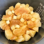 - 炊飯器にりんご、砂糖、バター、レモン汁、シナモンを入れて炊飯する。
