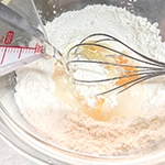 - 天ぷら粉(花ころも)とベーキングパウダーをボウルに入れ、泡立て器でよく混ぜ合わせる。