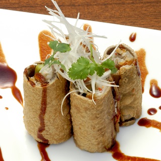 - 5を4等分にカットし、お皿に盛り付けたら、1のソースをかけ、しらが葱と香菜を飾り出来上がり。