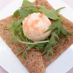 - フライパンを強火で熱し、サラダ油をひき5のガレット生地を流し入れ、フライパンを回しながら均一にのばす。