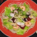 キャベツのシャキシャキした食感とエビ、タコ、あさりなど海の幸を楽しめるサラダそばです。お好みでコクのあるごまわさびドレッシングを適量使い、ちょっぴり辛めでお楽しみください。食楽彩々そば処みよ田監修レシピ。