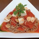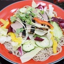 初夏が旬の鰹のたたきと、フレッシュサラダを合わせた冷たいお蕎麦です。食楽彩々そば処みよ田監修レシピ。