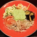 色とりどりの夏野菜と小海老をのせた冷たいお蕎麦に、夏に美味しい枝豆をすりつぶしてかけました。食楽彩々そば処みよ田監修レシピ。