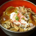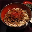 希少な桜肉と旬のなめこを味噌煮込み風にアレンジし、かけそばに添えました。食楽彩々そば処みよ田監修レシピ。