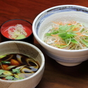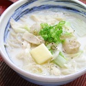 旬の野菜と豆乳を使った温かいかけそばです。お好みでバターを入れてお召し上がりください。